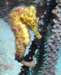 While boat diving is available at most of the dive shops on Bonaire, the more popular way to explore the beautiful reefs is via shore diving. The over 80 shore dive sites that are located along the island's leeward side are marked with rocks painted yellow with the dive site name written on it. Pull over, drive onto the beach (covered with chunks of large, dead coral), grab your gear, and get into the water. A short swim across a sandy bottom with scattered coral heads takes you to the drop off. Here the reef slopes down from about 35' to 80'-100'. Turn left or right, enjoy the many sights, turn around at 1/2 tank and back the way you came. Head back to shore, exit, drive to the next site on your list and repeat.